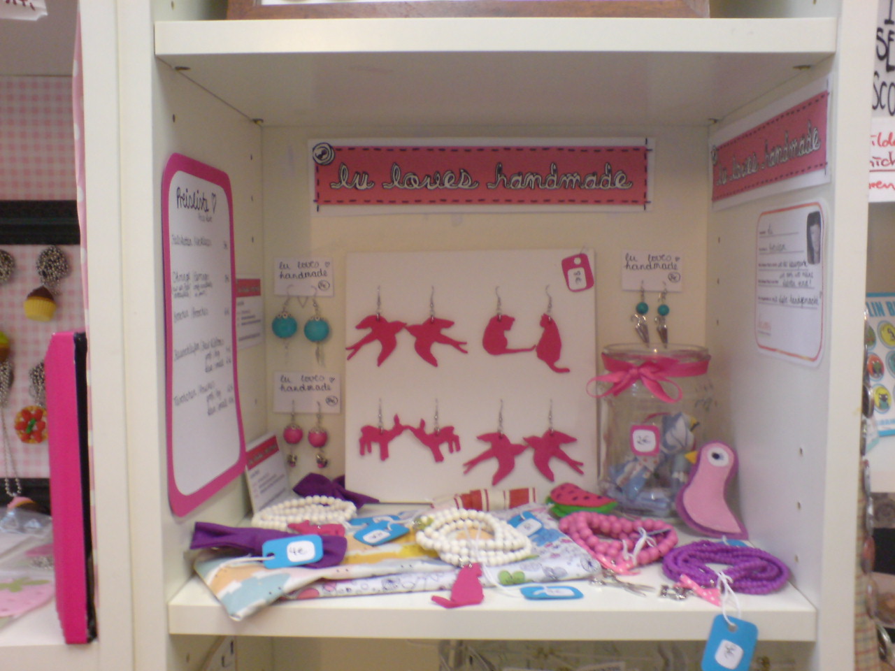 I’ve got some big news for you! :) Some weeks ago, while I was spending my day in Berlin, I saw a very interesting shop which sells stuff from a lot of different artists. The owner of the shop wants to support young artists and one can rent a panel in a shelf there to sell handmade things. I made an appointment with them and showed my things and they liked them. :) So I prepared everything, went there yesterday and brought my handmade things to the shop. They will get 50% of the money if something is sold, I can keep the other 50% myself and I think this is great for the beginning. So just keep your fingers crossed for me that the customers will like the things I make! :) I’m so excited and so proud of myself and I can’t wait to get to know if it goes well… :)