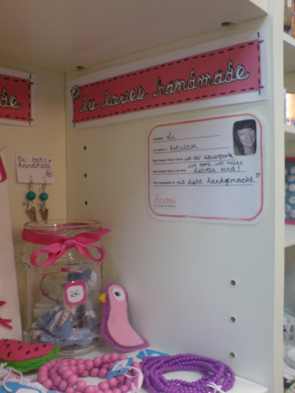 I’ve got some big news for you! :) Some weeks ago, while I was spending my day in Berlin, I saw a very interesting shop which sells stuff from a lot of different artists. The owner of the shop wants to support young artists and one can rent a panel in a shelf there to sell handmade things. I made an appointment with them and showed my things and they liked them. :) So I prepared everything, went there yesterday and brought my handmade things to the shop. They will get 50% of the money if something is sold, I can keep the other 50% myself and I think this is great for the beginning. So just keep your fingers crossed for me that the customers will like the things I make! :) I’m so excited and so proud of myself and I can’t wait to get to know if it goes well… :)