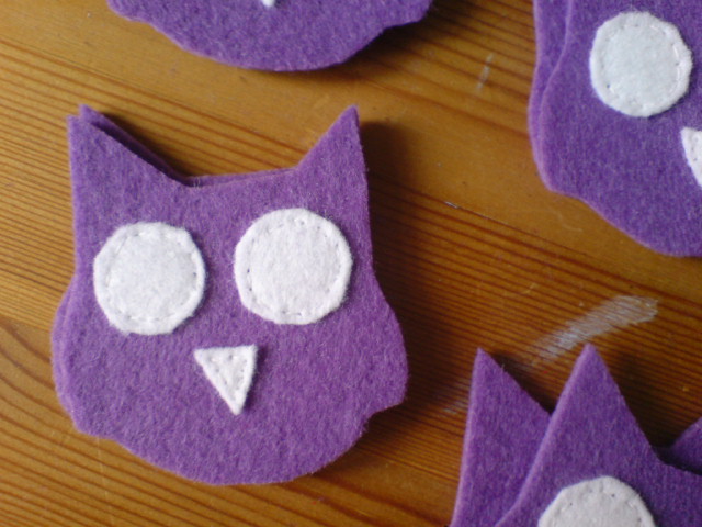 Next, add white eyes and sew them with white thread onto the owl bodies.