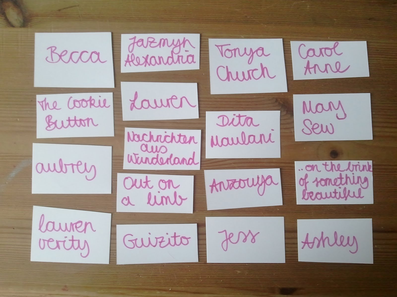 I wrote all the names on tiny cards and put them into a can, I rather like the old-fashioned way of determining a winner, instead of using a random number generator. I mixed the cards inside the can and took out one card with closed eyes. :)