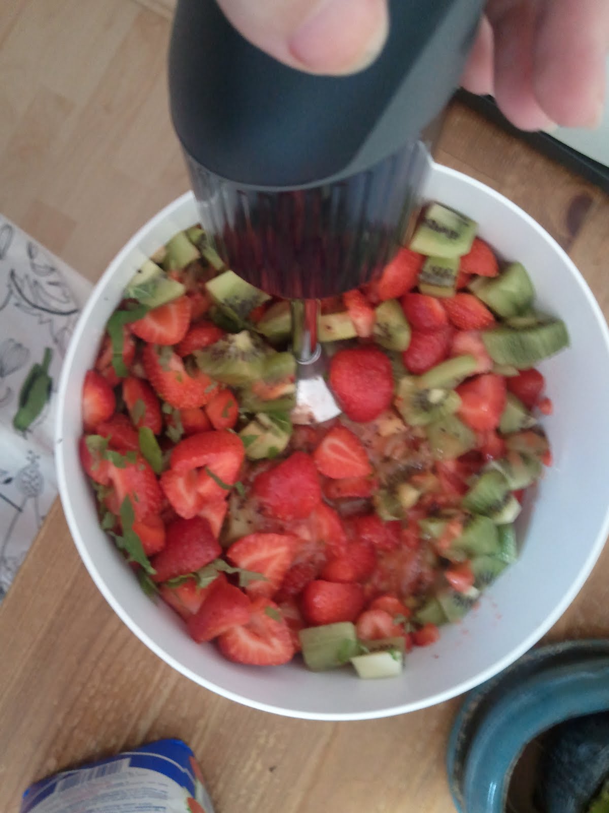 Hi! :) I was highly inspired by the delicious summer jam Ellen has sent me, so I decided to find out how to make jam myself and my mother told me how to do so. :) Today, Flo and I went to the market, bought some fresh red currants and a pot of lemon balm (you can’t imagine how fresh and summery this smells). Because I wanted to make LOTS of jam, I also went to the supermarket and bought strawberries and kiwis, some of my favourite fruits. :)