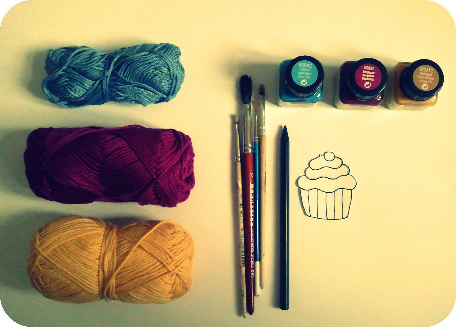 As a birthday present for a friend of mine, I bought a plain, white, cotton apron in the handicraft store. Moreover, you’ll need some wool or knitting yarn (mine is 100% cotton), textile colors, some paint brushes and a draft of your motive.