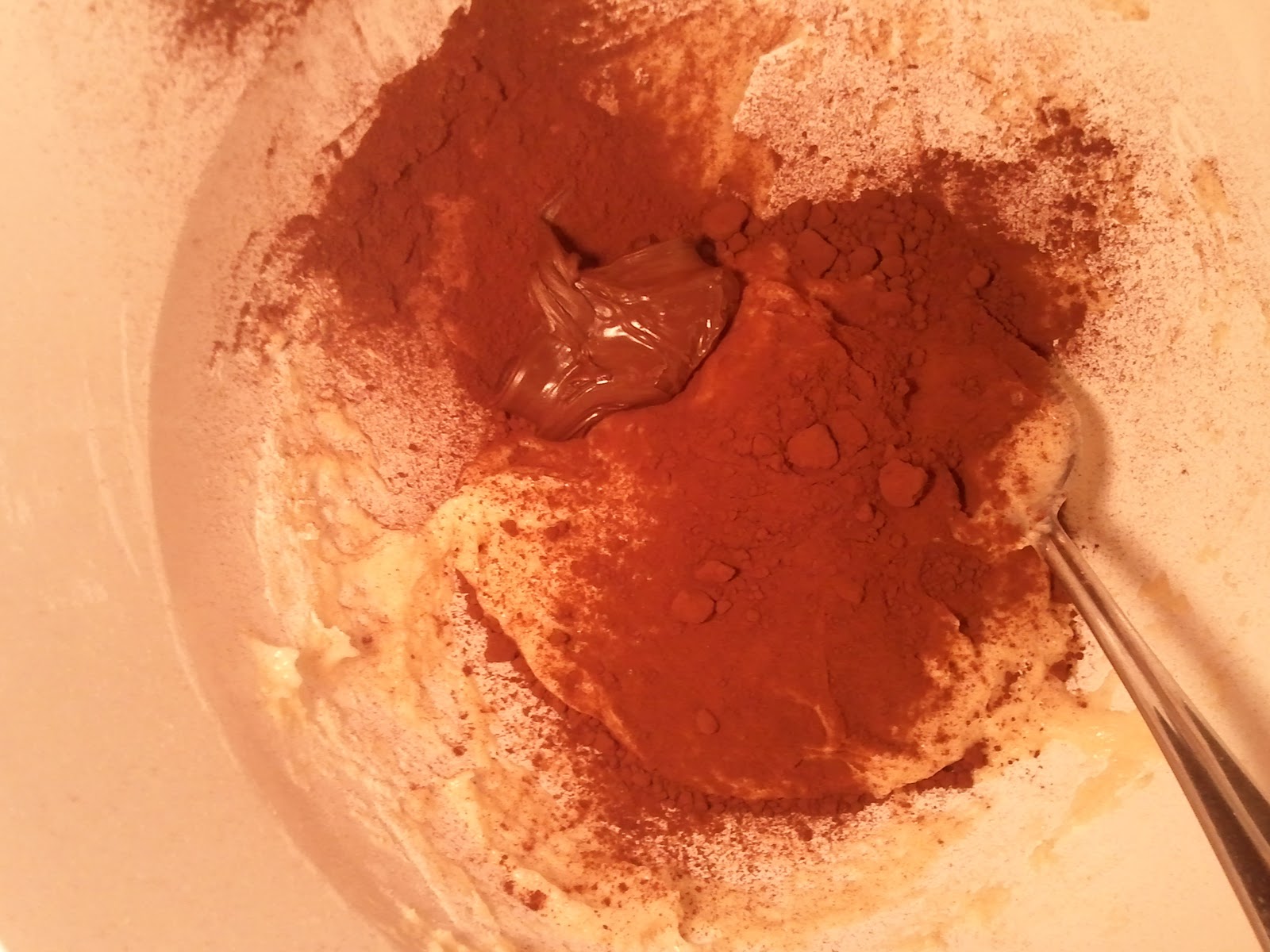 Afterwards, divide the whole mass of dough and distribute it to two different bowls. To one part of the dough, add the chopped apples, cinnamon and nuts, to the other half of the dough add chocolate cream and cocoa powder and again mix everthing.
