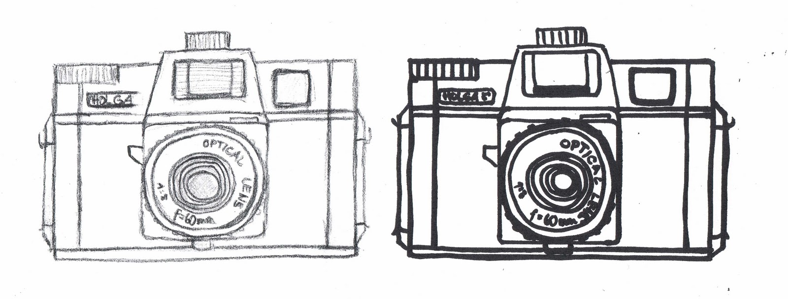 This is my Holga camera, first I made the left sketch with a pencil and then I went over the lines with a felt pen.