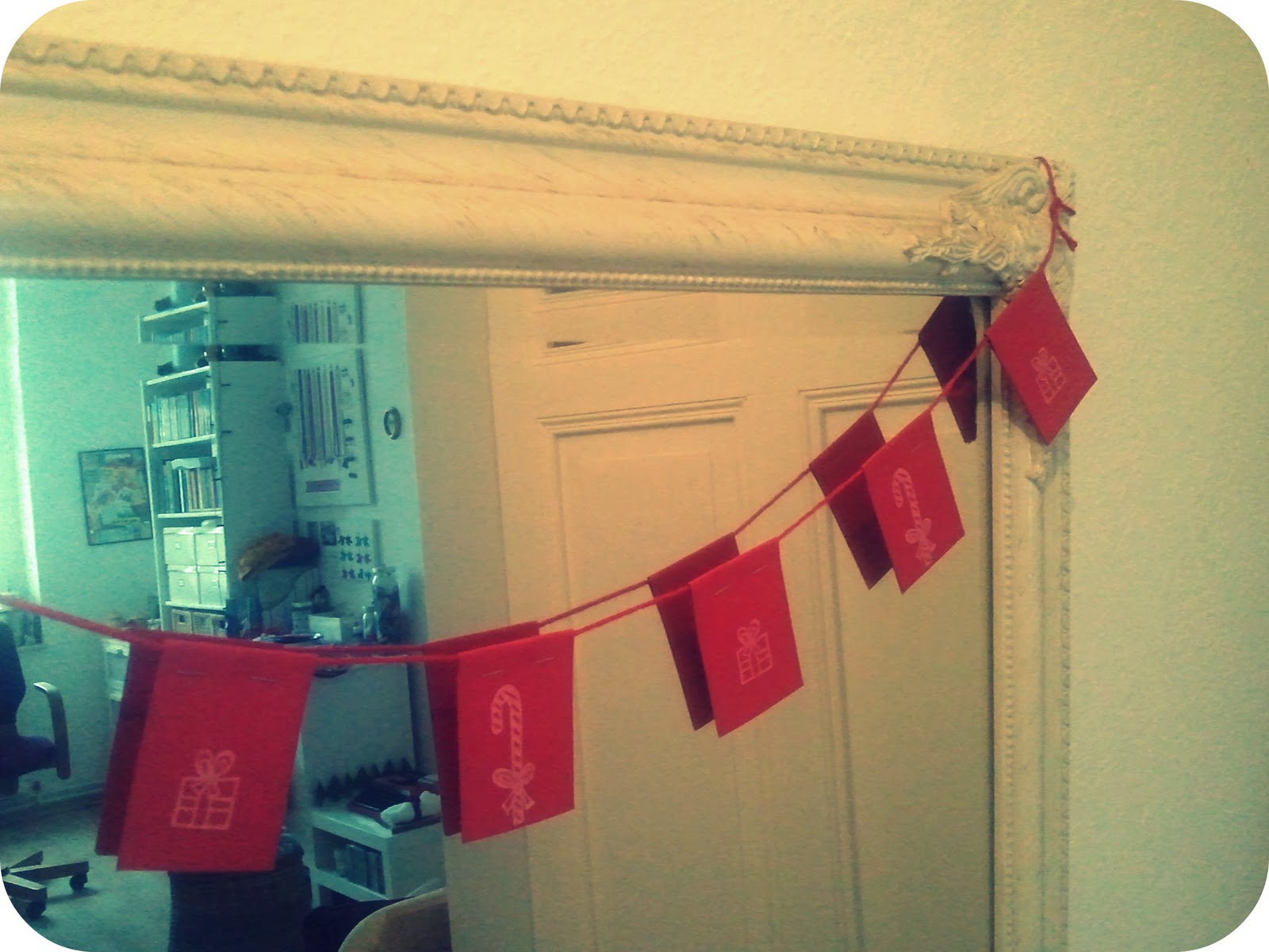 I made this paper garland for our hall, the white presents and candy canes are made with the stamps I recently made.
