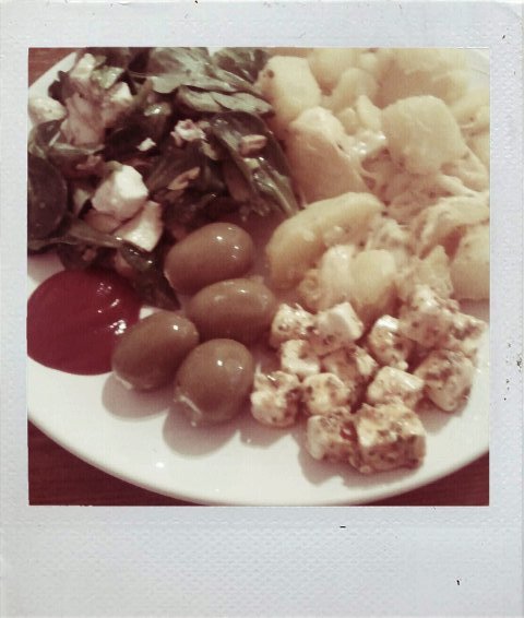 Our vegetarian Friday night dinner: Potatoes gratinated with cheese, olives, sheep’s milk cheese and field salad.