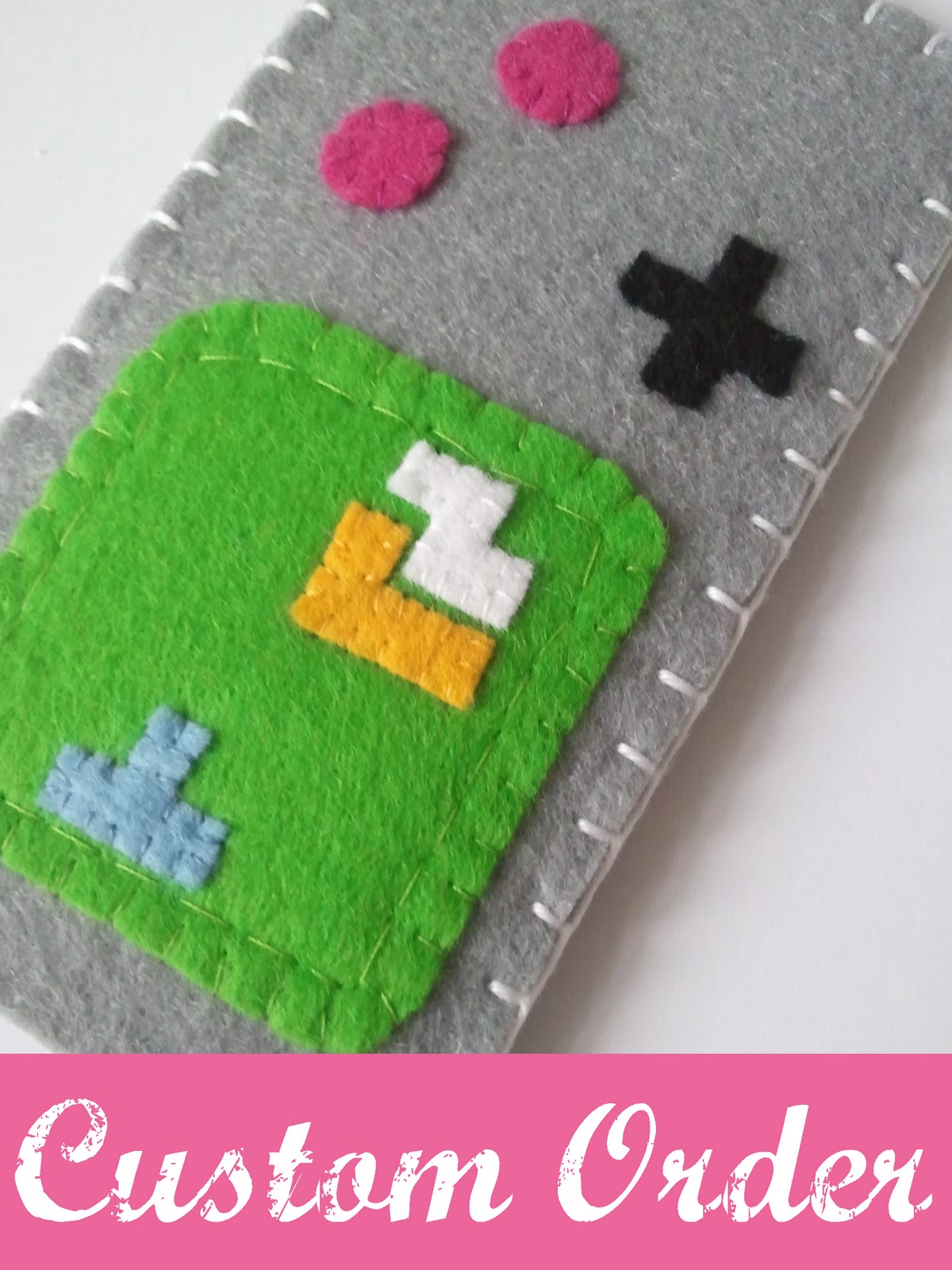 I was recently asked to make a customized phone pouch, a customer asked my to sew a gameboy pouch for her boyfriend who is a huge Tetris fan and here you can see what has come out of it. :)