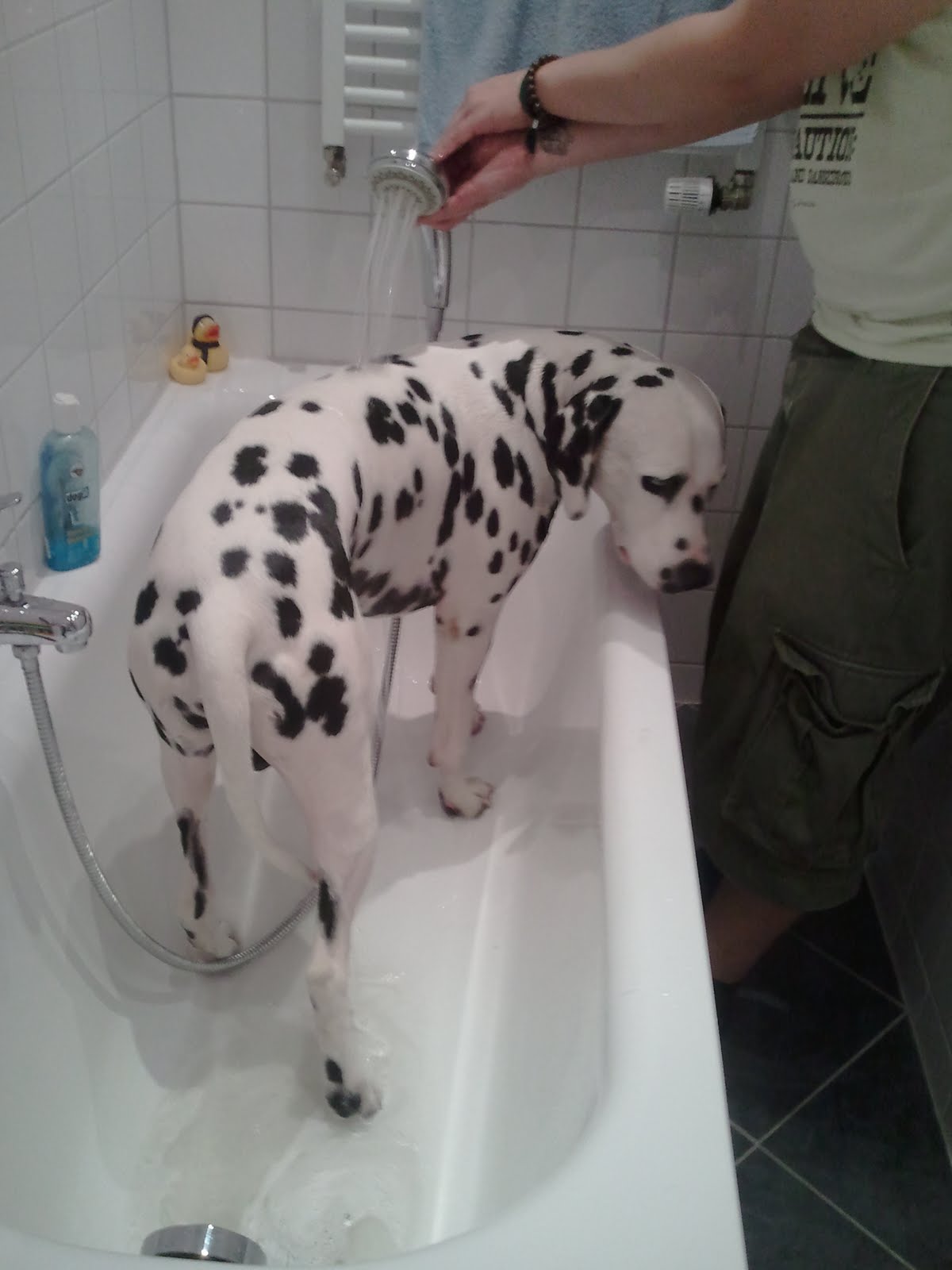 He rolled himself around in mudd and stank unbearably, so we had to give him a shower. :) Poor boy, but he even has his own puppy shampoo. :)